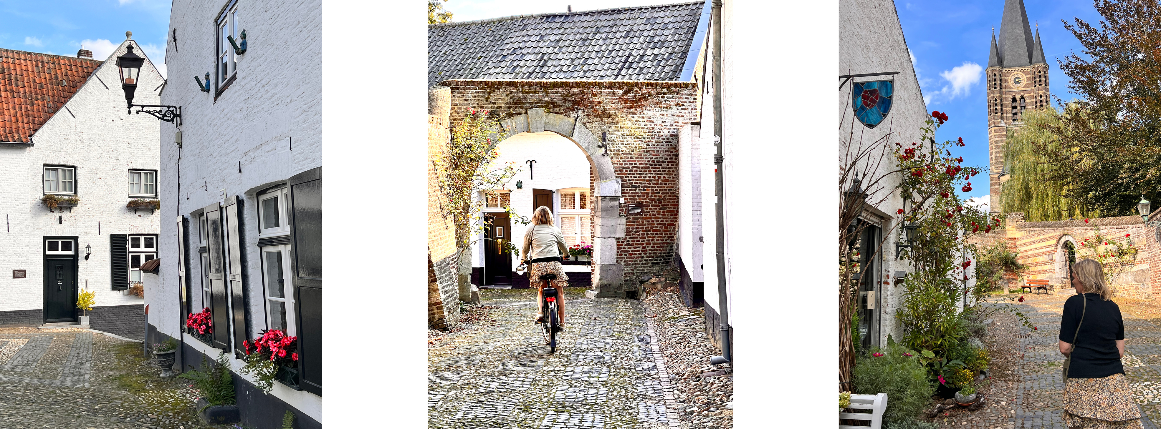 Een uurtje later hobbelen we met onze fietsen over de kinderkopjes door de straatjes van het witte ‘vrouwenstadje’ Thorn. Met zijn witgeschilderde huizen, abdijkerk en monumentale panden begeef je je meteen in de geschiedenis van het stadje. Een geschiedenis van vrouwen. Want Thorn werd als zelfstandig staatje achthonderd jaar lang geleid door 33 opeenvolgende abdis-vorstinnen. Zij regeerden over de ‘stiftdames’, vrouwen van de allerhoogste hoge komaf die er een adellijke opvoeding kregen. “Ze werden klaargestoomd voor het leven aan het hof”, zegt VVV-gids Annelies Frenken. “Hier hadden ze de vrijheid bevochten, al was die beperkt, maar ze hadden een leuk leven.” In 1798 kwam Thorn onder de Fransen te vallen en de dames vluchtten in 30 gouden koetsen naar Essen. Het paleis werd gesloopt. Maar waarom is het stadje dan wit? “Dat heeft met het verval en diepe armoede te maken”, vertelt Annelies. “Ramen aan de voorkant werden dichtgemetseld om geen belasting te hoeven betalen, en om armoede te maskeren verfden mensen hun huizen wit.”